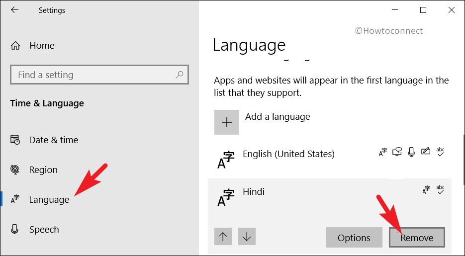 Next, click on the ‘Language’ tab from the left sidebar. Then, click on the language pack you wish to remove to expand the tile. Next, click on the ‘Remove’ button from the expanded view to uninstall the language from your system.