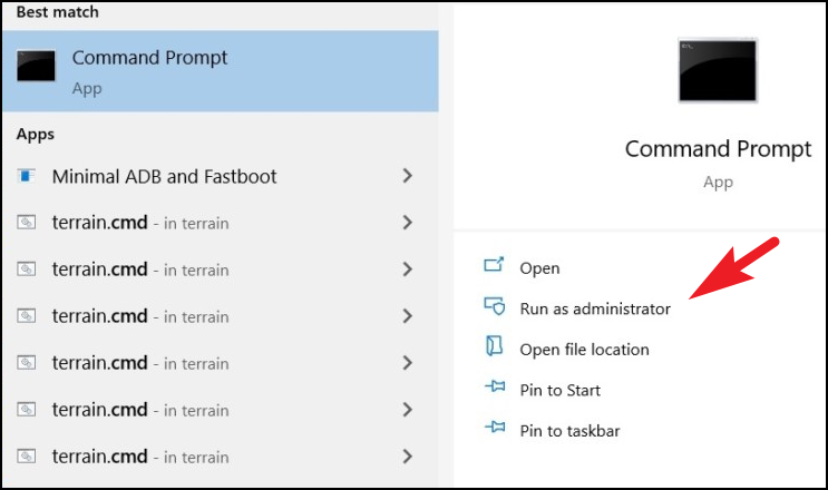 Head to the Start Menu and type ‘Command Prompt’ to search for it. Then, click on the ‘Run as administrator’ option from the right section of the menu to continue.