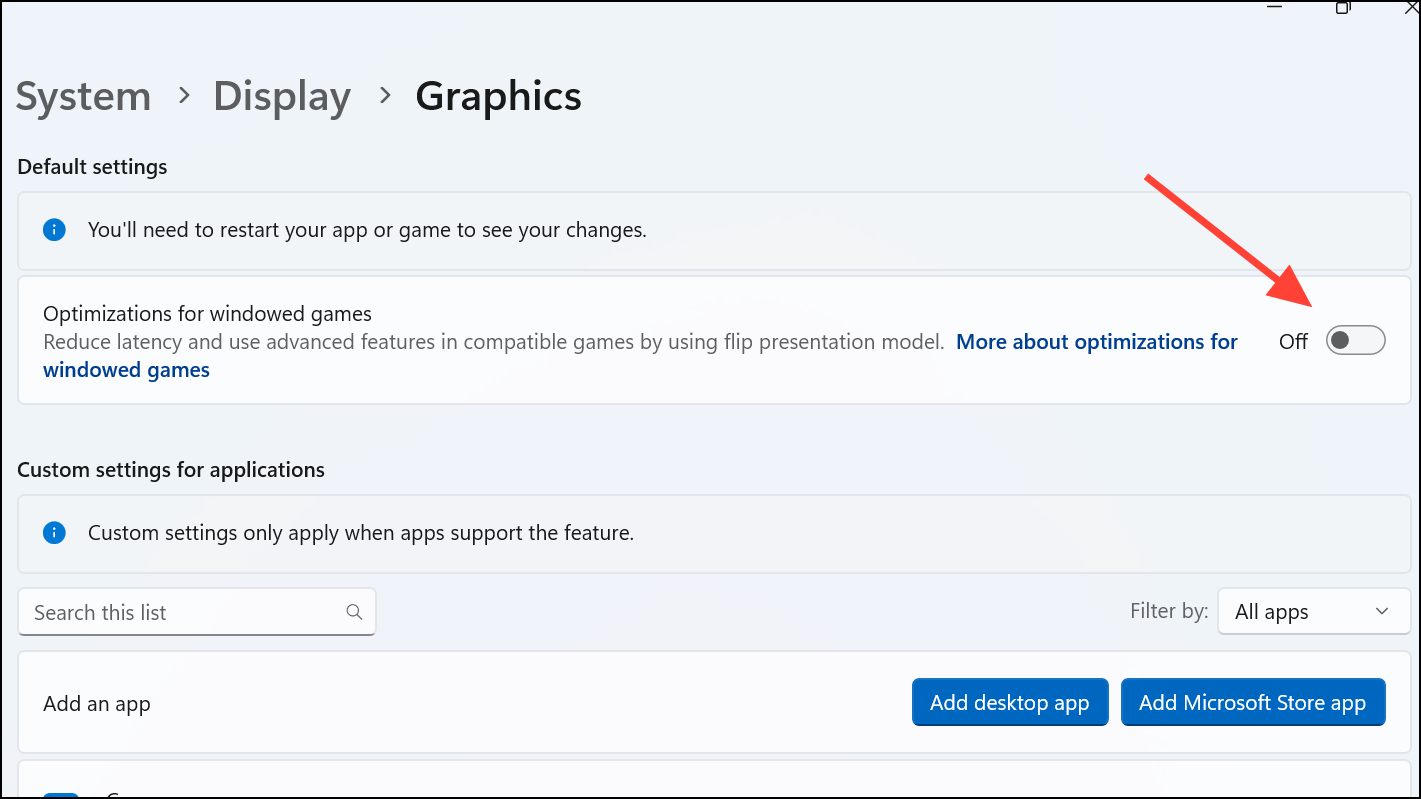 Step 3: Click "Change default graphics settings" and toggle off the option "Optimizations for windowed games." Restart your PC to apply the changes.
