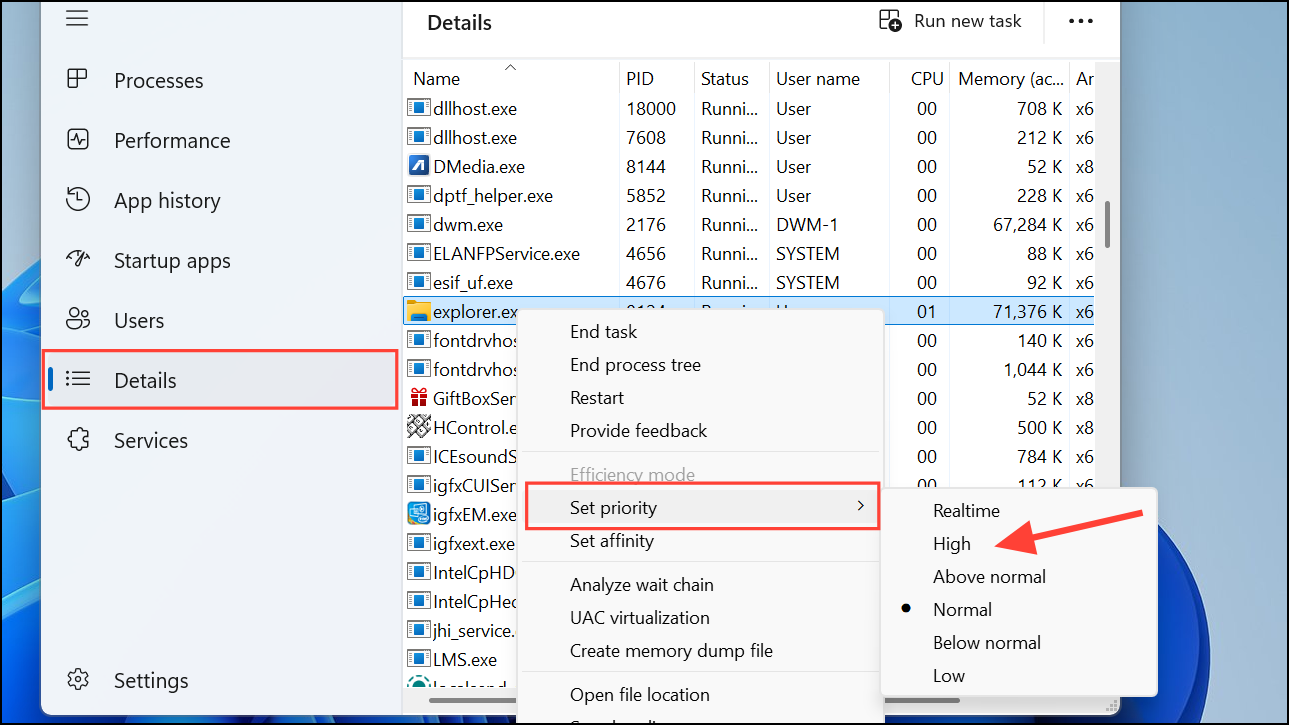 Step 3: Then press Ctrl + Shift + Esc to open Task Manager, navigate to the "Details" tab, right-click the application, and select "Set priority" > "High."