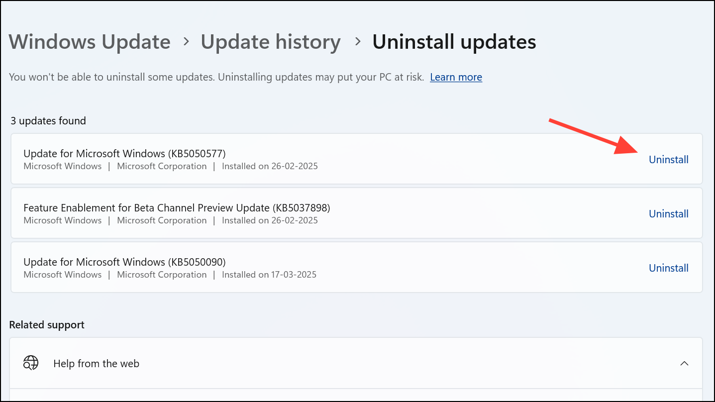 Step 3: Select the update and click "Uninstall." Restart your PC after completion.