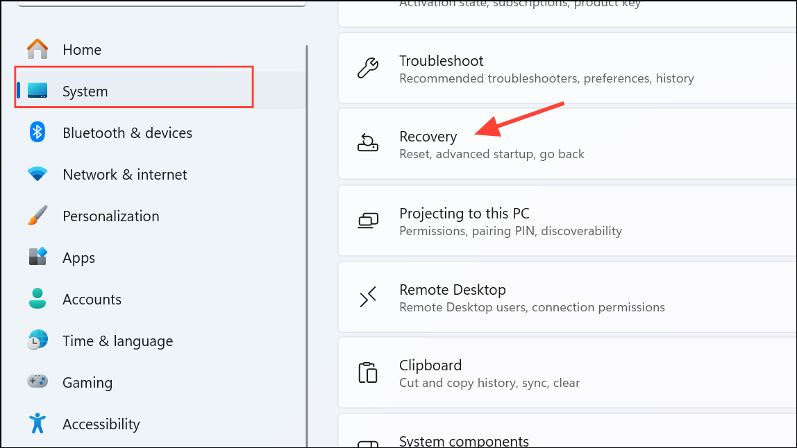 Step 1: Go to Settings > System > Recovery.