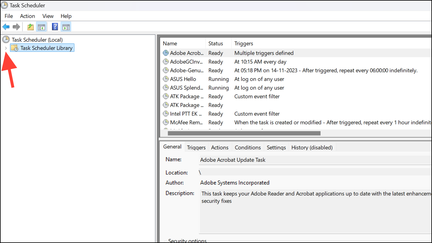 Step 2: In the Task Scheduler window, expand the Task Scheduler Library by clicking the arrow next to it in the left pane.