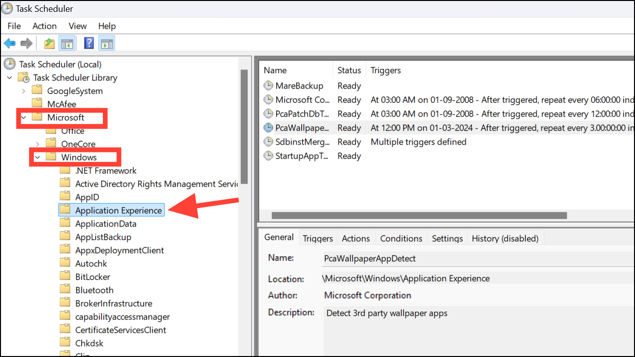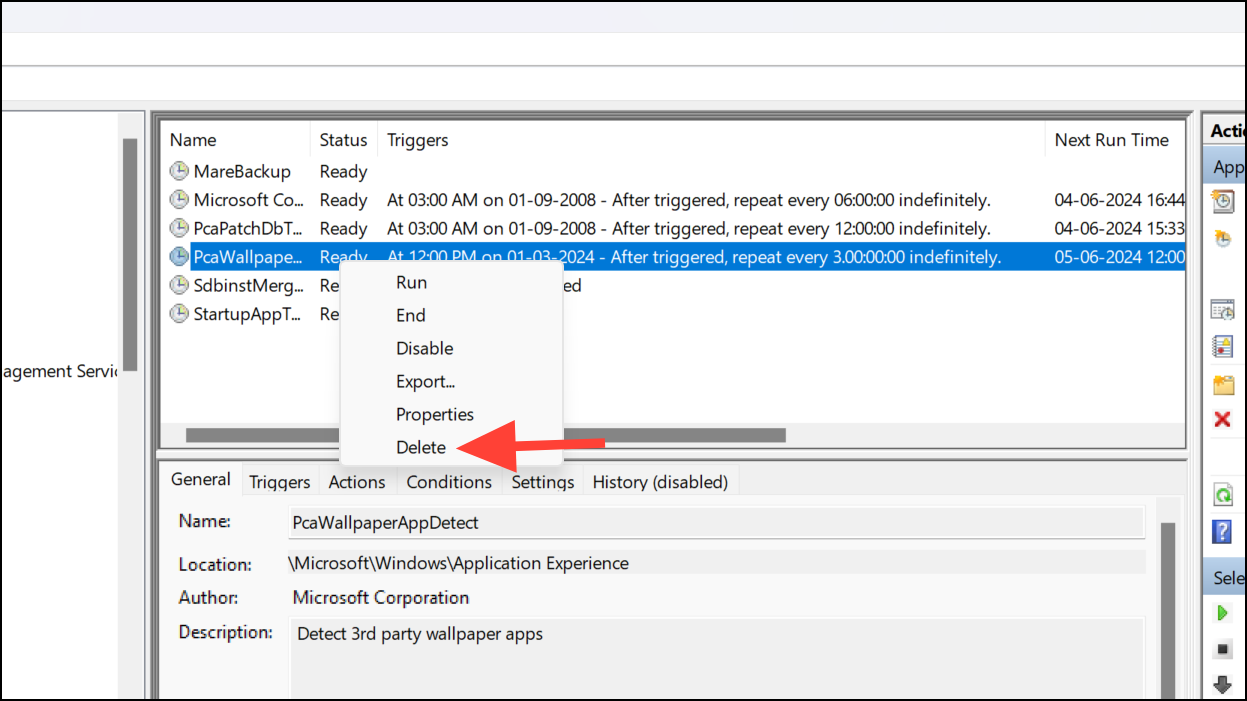 Step 4: In the middle pane, locate the task named PcaWallpaperAppDetect. Right-click on it and choose Delete from the context menu.