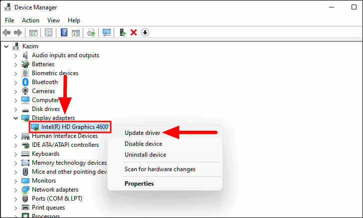 - Right-click on your graphics adapter (e.g., Intel, NVIDIA, AMD) and select Update driver.