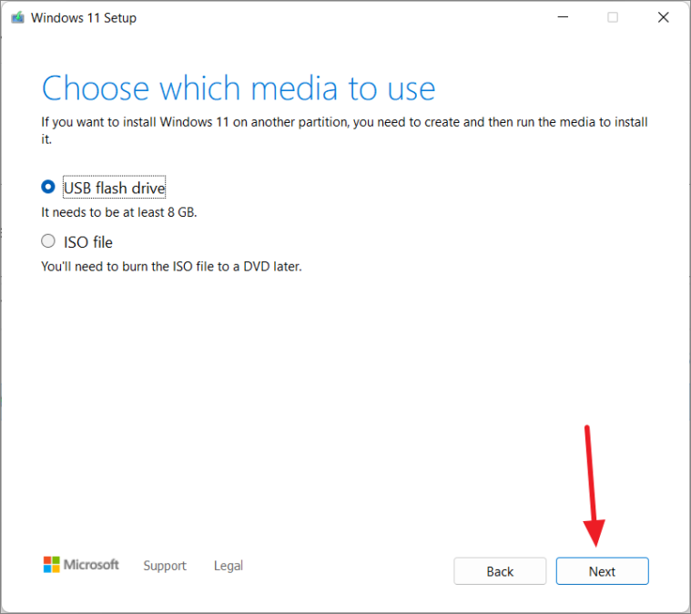 - Select the media type (USB flash drive or ISO file for DVD) and click Next.