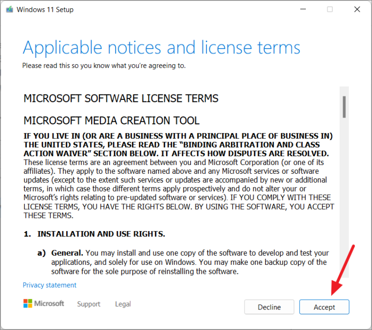 - In the Windows 11 Setup window, accept the license terms by clicking on Accept.