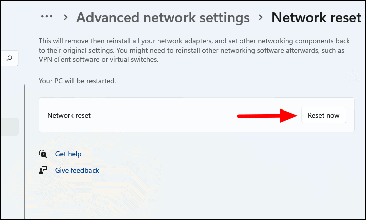 - Click Reset now next to Network reset.