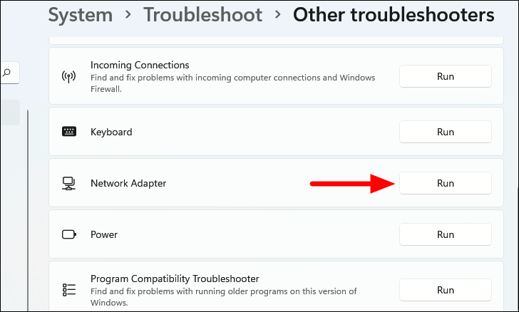 - Find Network Adapter and click Run next to it.