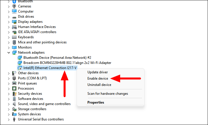 - Right-click your Ethernet adapter. If you see Enable device, click it to enable the adapter.