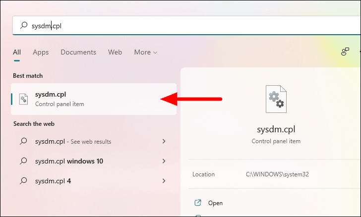 - Press the Windows key, type sysdm.cpl, and select it from the search results to open System Properties.