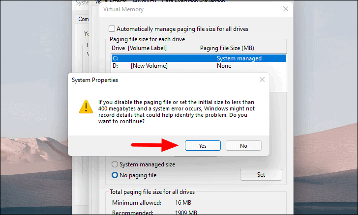 - Select your system drive (usually C:), choose No paging file, and click Set.