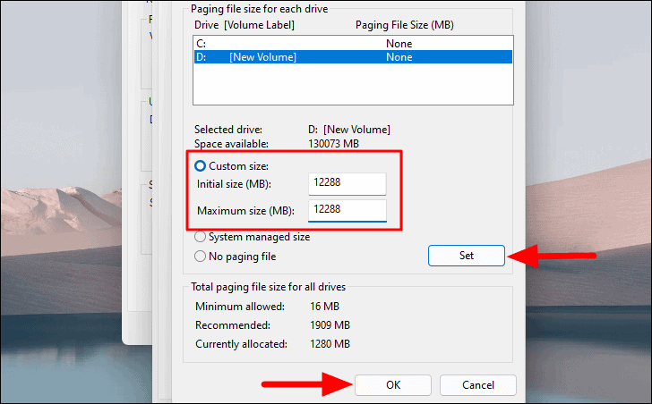 - Select another drive with sufficient space, choose Custom size, and enter a value that's 1.5 to 2 times your physical RAM in both the initial and maximum size fields. For example, if you have 4 GB of RAM (4096 MB), you can enter 6144 MB in both fields.