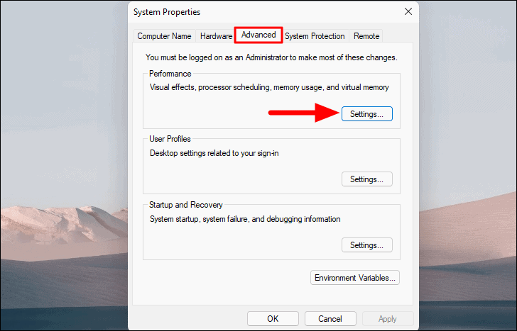 - In the System Properties window, go to the Advanced tab and click on Settings under the Performance section.