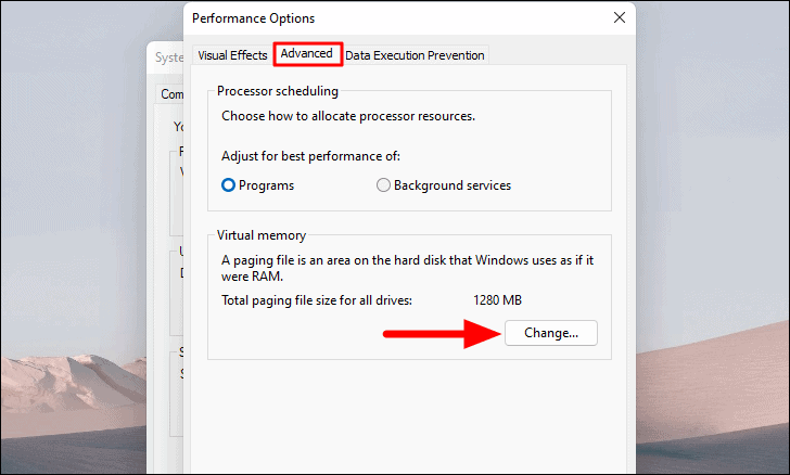 - In the Performance Options window, navigate to the Advanced tab and click Change under Virtual Memory.
