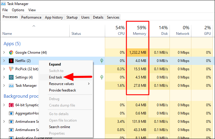 The application will close and no longer appear in the Task Manager. Repeat these steps to close other unnecessary apps and reduce memory usage.