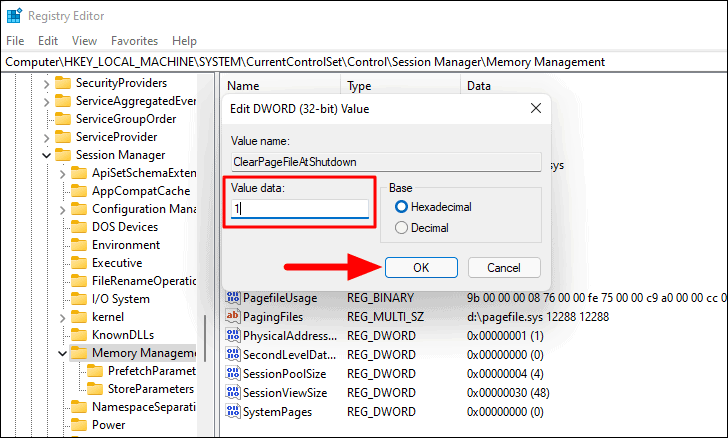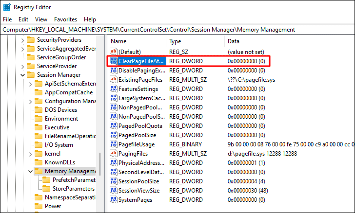 HKEY_LOCAL_MACHINE\SYSTEM\CurrentControlSet\Control\Session Manager\Memory Management- In the right pane, double-click on ClearPageFileAtShutdown.