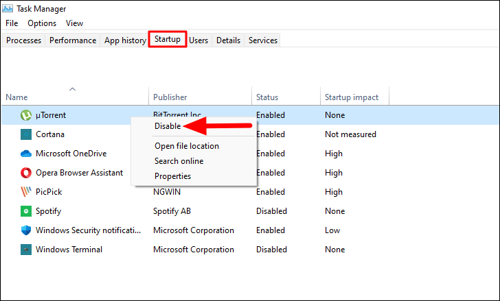 - Open the Task Manager as described earlier and navigate to the Startup tab at the top.