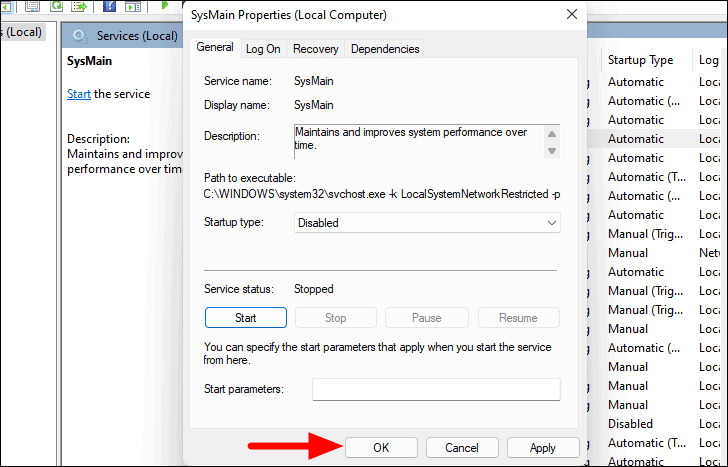 After disabling the SysMain service, monitor your system's performance to see if memory usage improves.