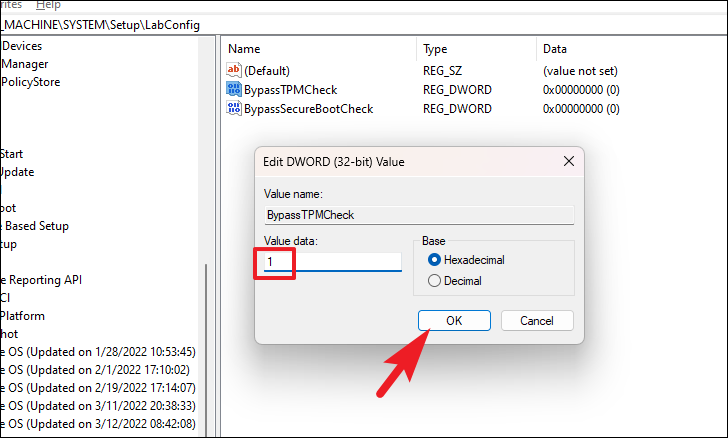 Step 5: Double-click on BypassTPMCheck, set the value data to 1, and click OK. Repeat this for BypassSecureBootCheck.