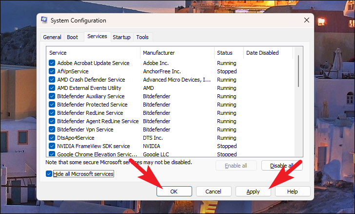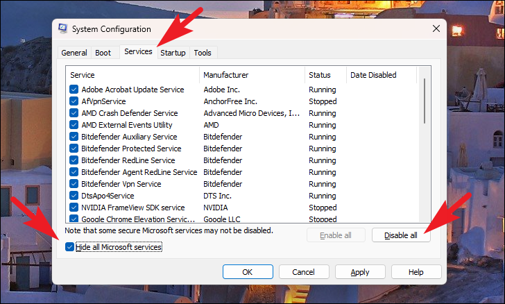 Step 3: Go to the Services tab. Check Hide all Microsoft services and then click Disable all.