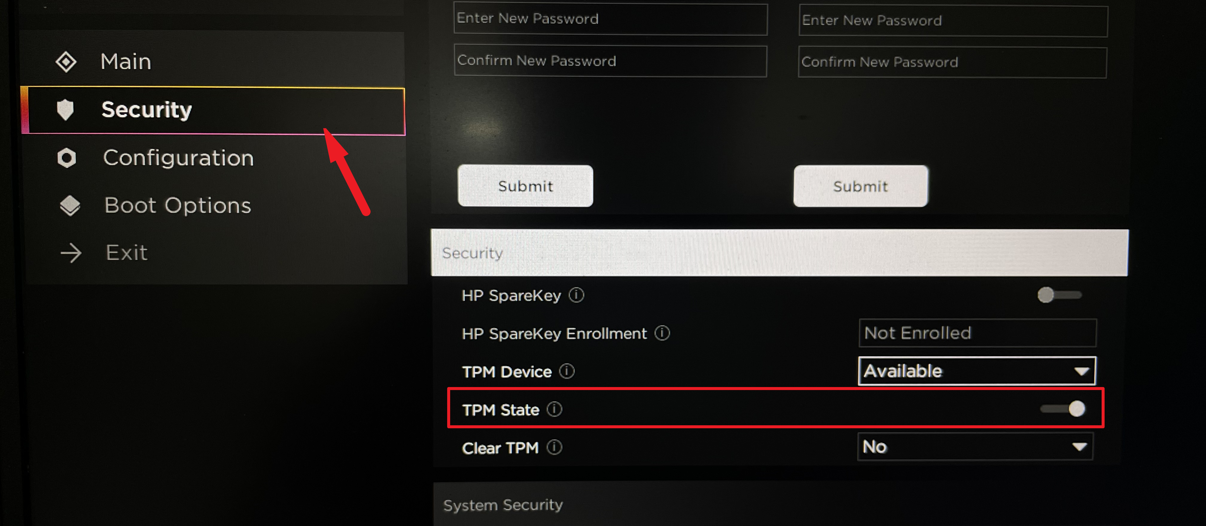 Step 4: In the BIOS menu, navigate to the Security tab. Find TPM or Trusted Platform Module and enable it.