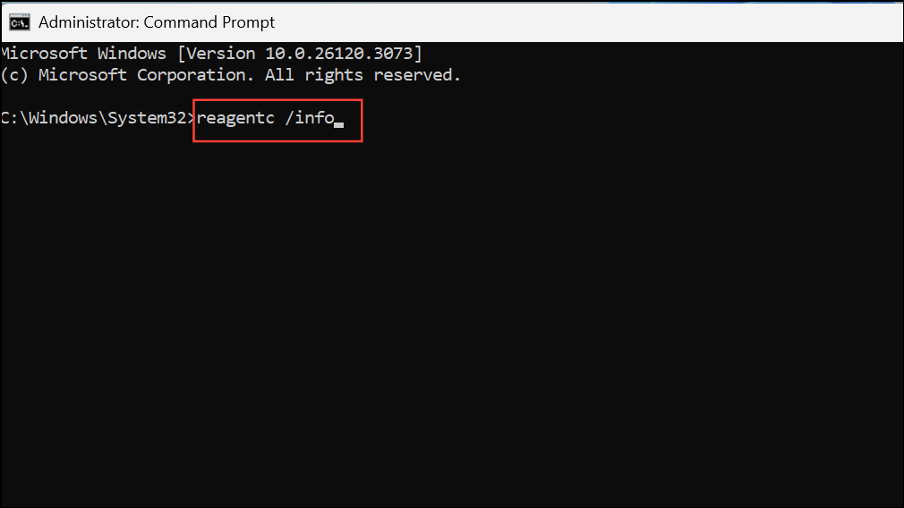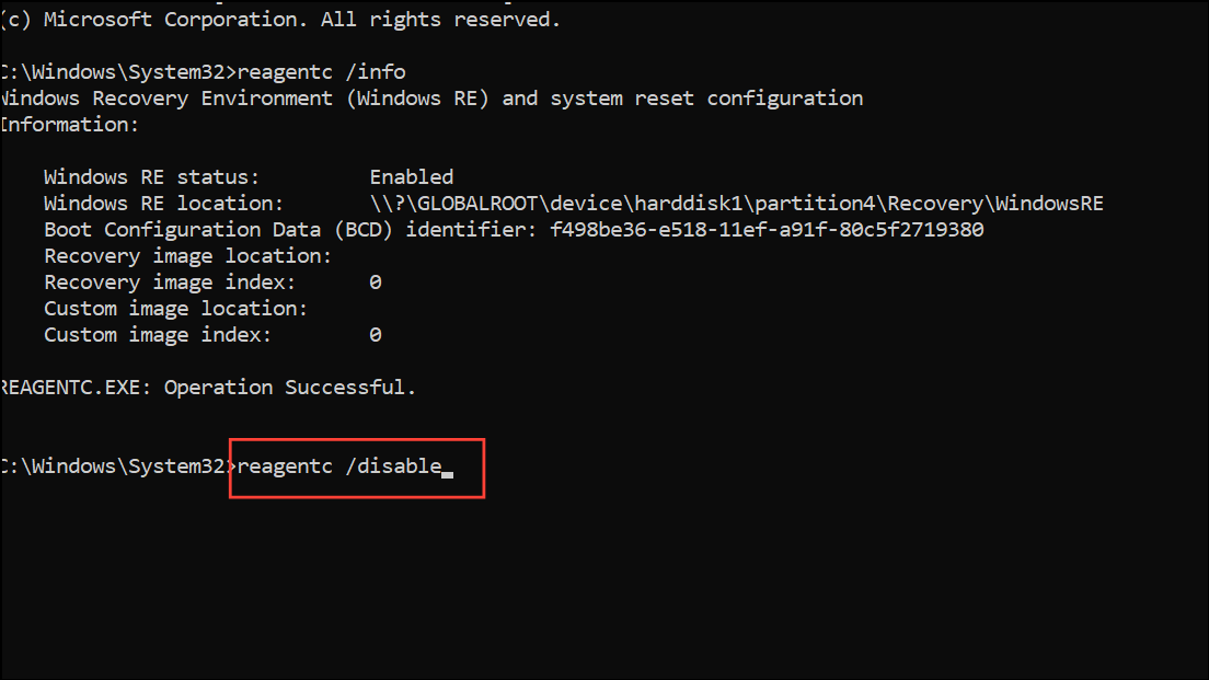 Step 3: Temporarily disable the Windows Recovery Environment by typing reagentc /disable. This step prevents system conflicts while you modify the partition.