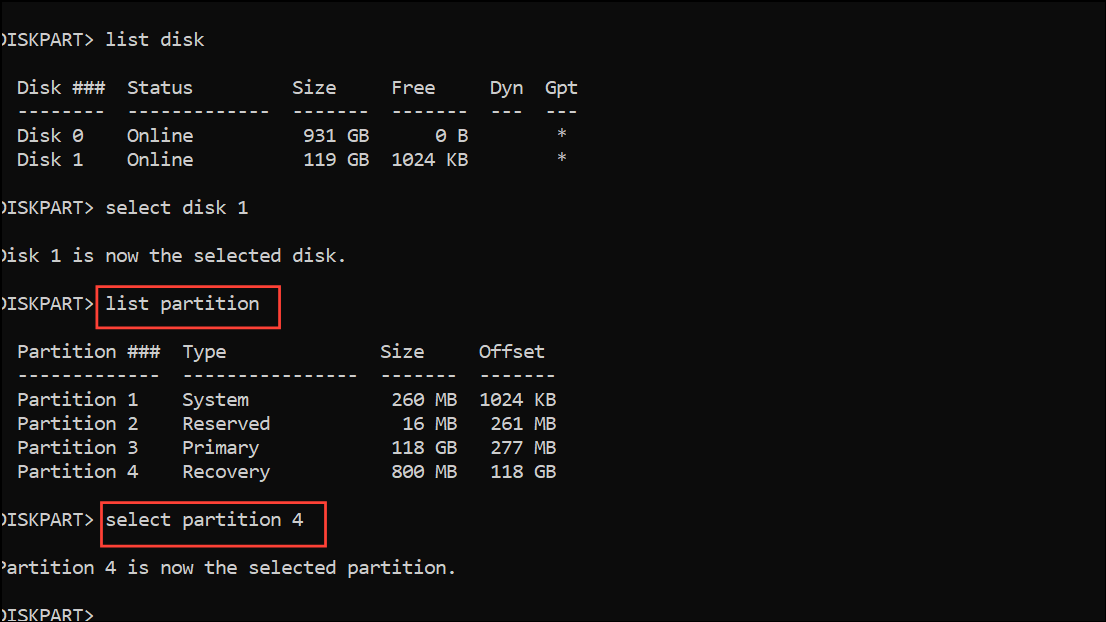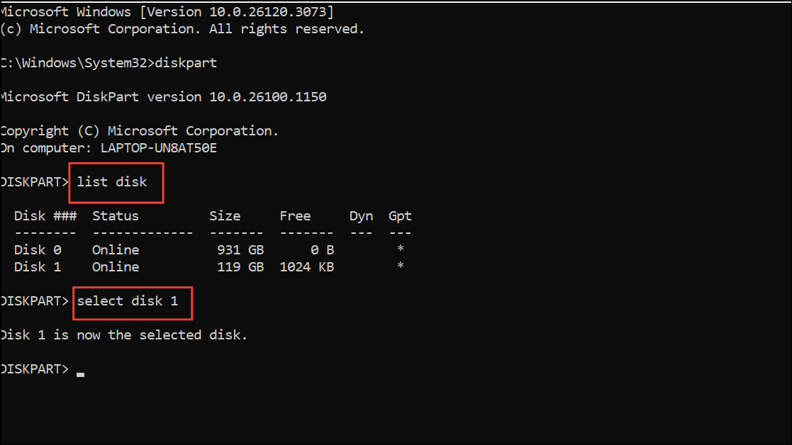 Step 5: List all disks with list disk, then select the correct disk using select disk X (replace X with your disk number).