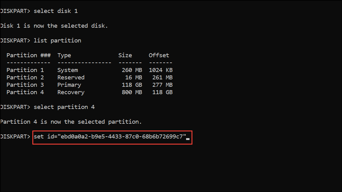 Step 7: Change the partition type to a basic data partition with set id="ebd0a0a2-b9e5-4433-87c0-68b6b72699c7" and remove special GPT attributes using gpt attributes=0x0000000000000000. This step makes the partition manageable in Disk Management.