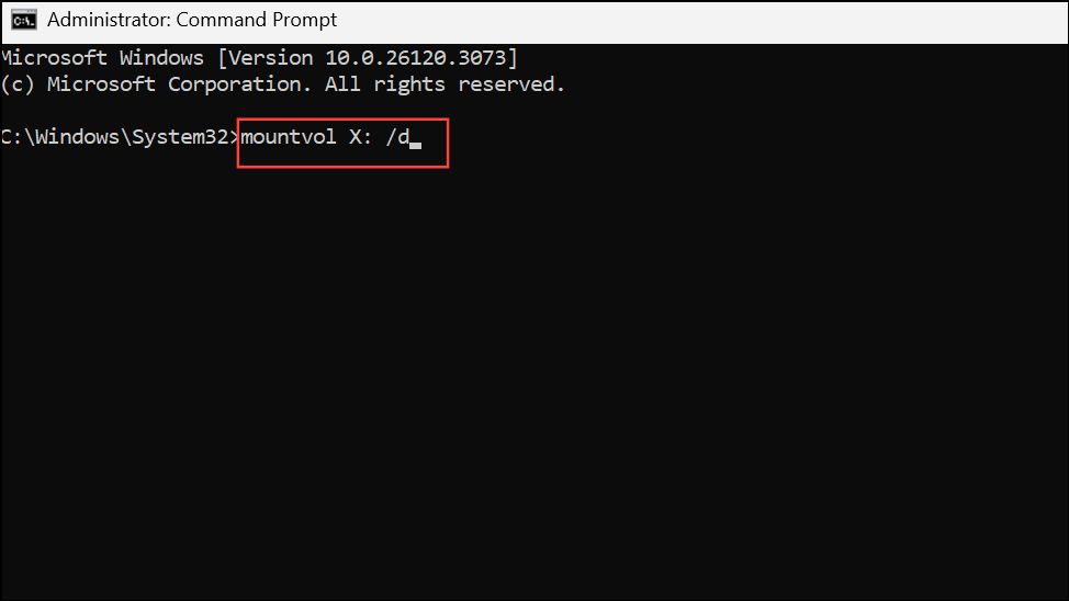 Step 2: Enter mountvol X: /d (replace X with the assigned drive letter). This instantly unmounts the partition, removing it from File Explorer.