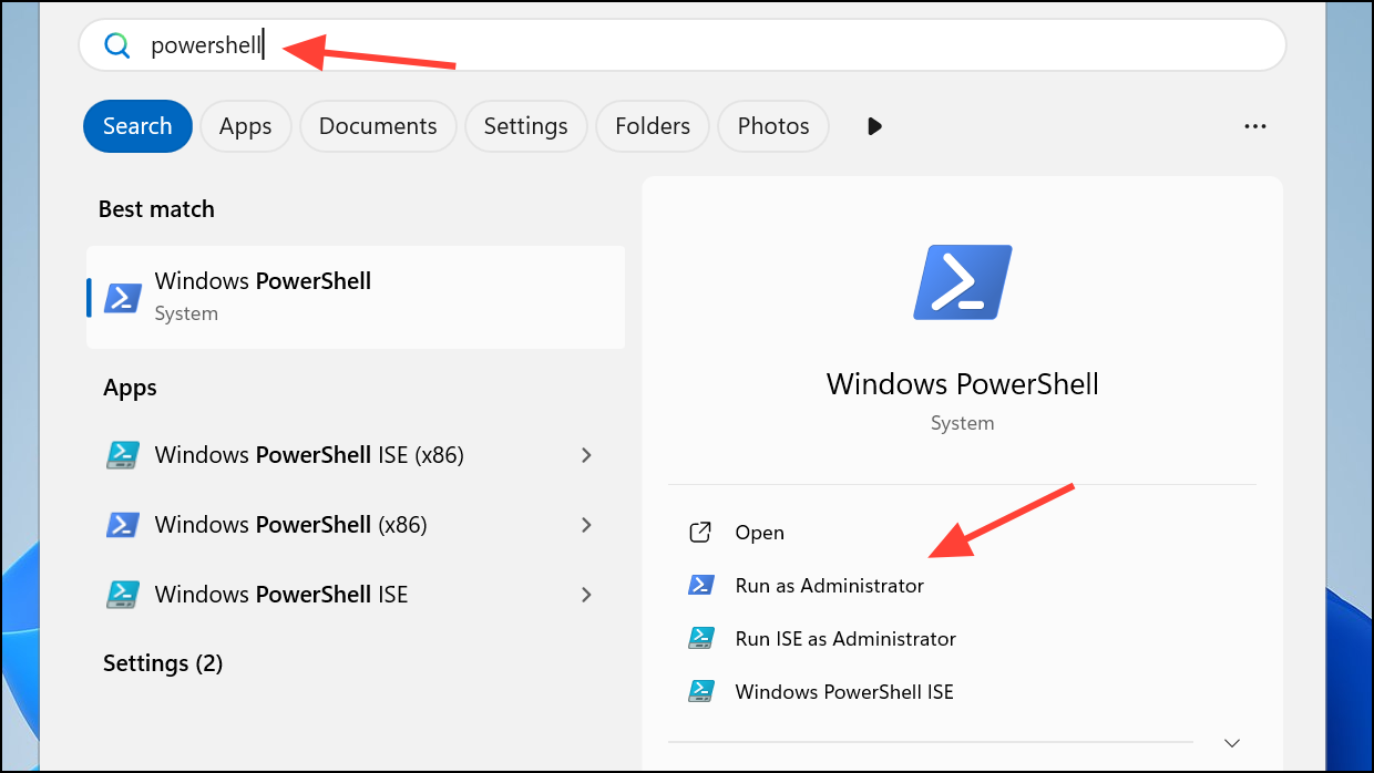 Step 1: Open Windows PowerShell as administrator. Search for PowerShell, right-click, and select Run as administrator.