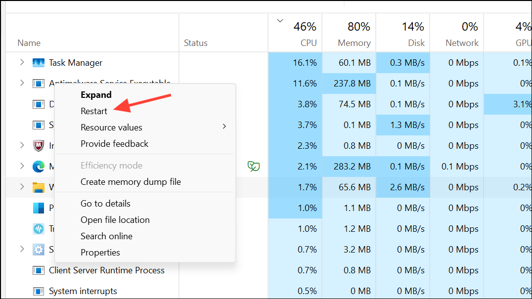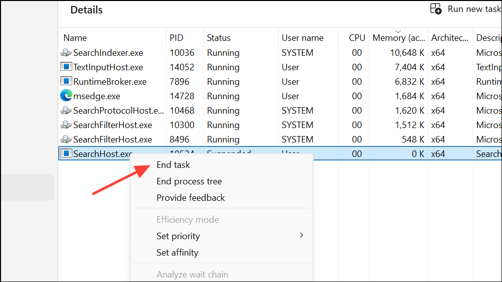Step 2: Locate SearchHost.exe or SearchUI.exe. Right-click the process and choose End task. Windows will automatically restart the process the next time you search.