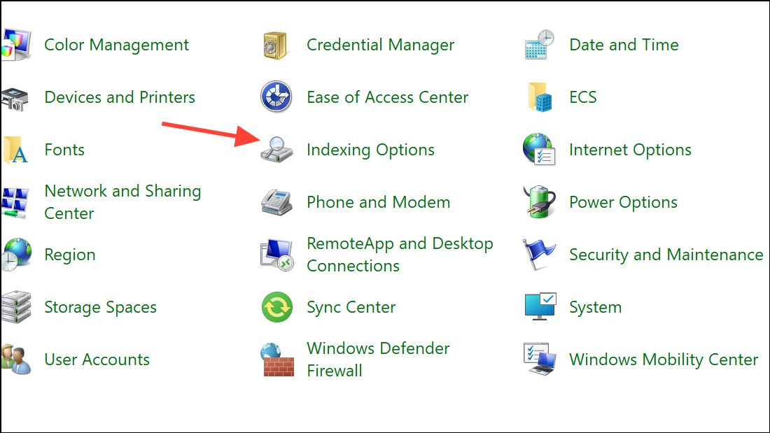 Step 2: Switch the Control Panel view to Large icons, then click Indexing Options.
