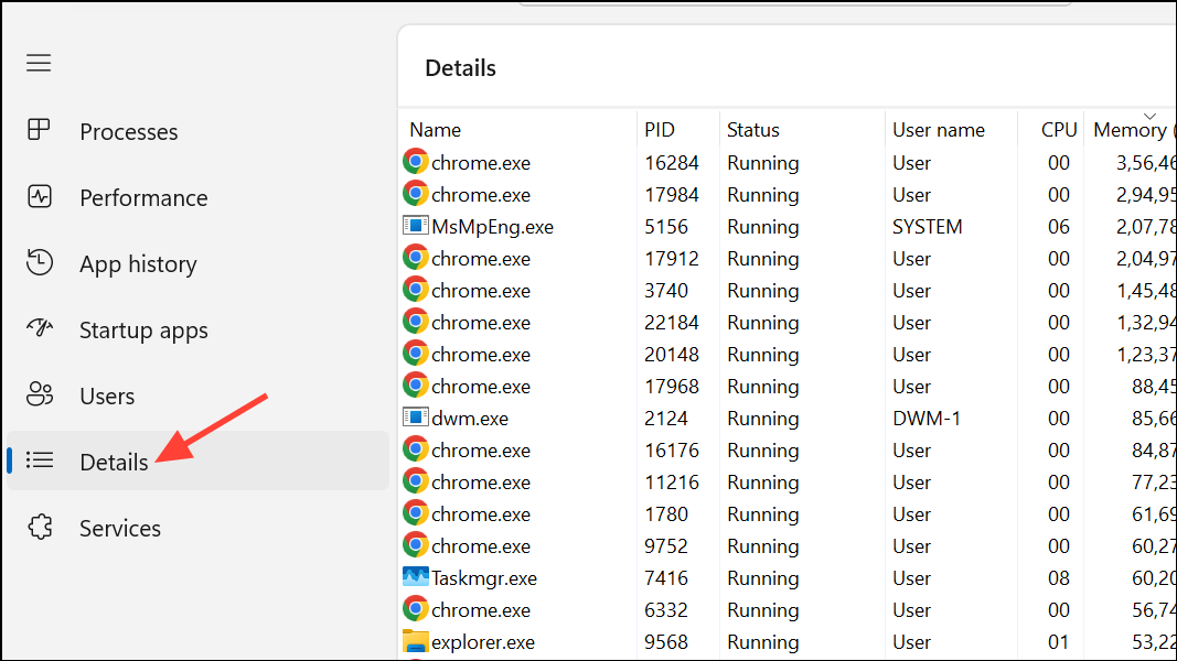 Step 1: Open Task Manager with Ctrl + Shift + Esc. Go to the Details tab.