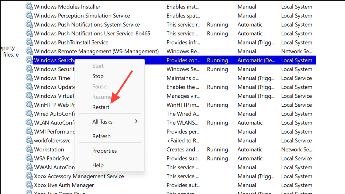 Step 4: Find Windows Search, right-click it, and select Restart.