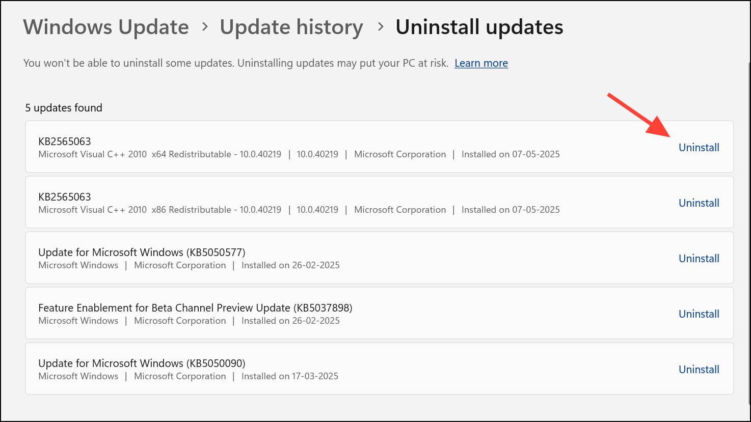 Step 2: Click Uninstall updates and identify any recent updates (e.g., KB5058411, KB5054979) that coincide with the search issue.