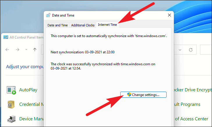 - In the Date and Time window, go to the Internet Time tab and click Change settings...