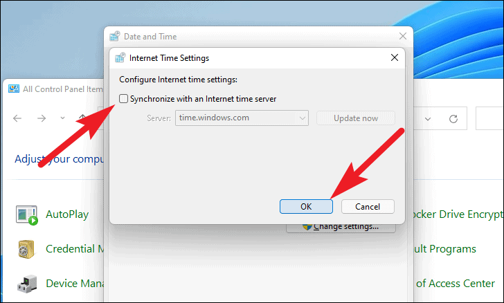 - Uncheck the box next to Synchronize with an Internet time server and click OK.