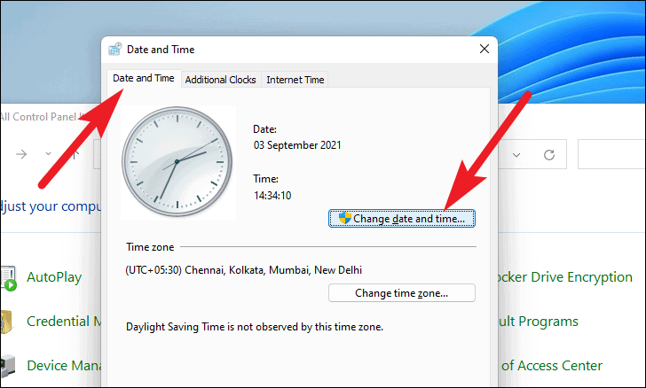 - Back in the Date and Time window, click on the Date and Time tab and select Change date and time...