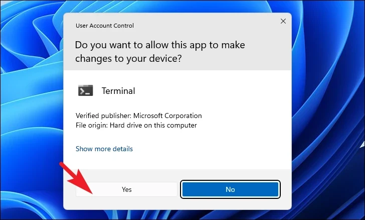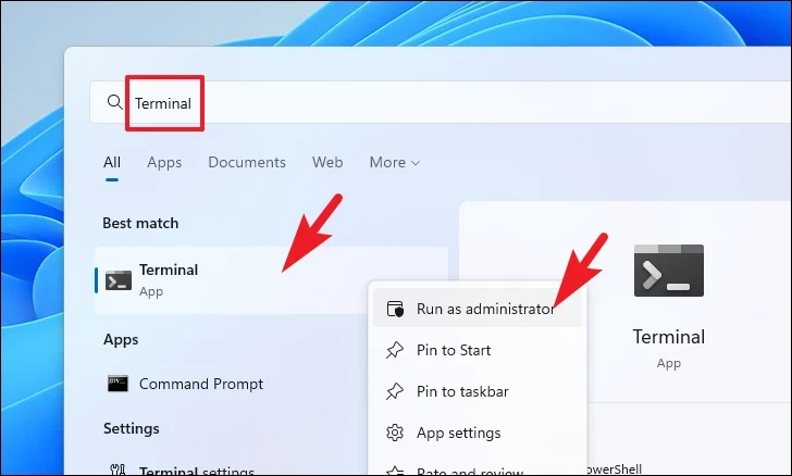 Step 1: Open the Terminal with administrative privileges. Click on the Start menu and type Terminal. Right-click on the Terminal app from the search results and select Run as administrator.