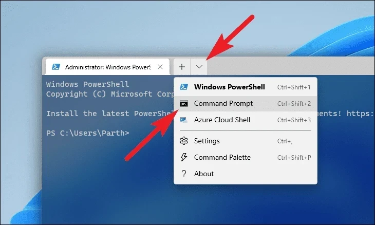 Step 3: Open the Command Prompt within the Terminal. Click the chevron arrow and select Command Prompt.