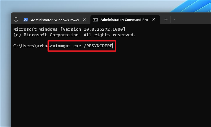 Step 5: Next, synchronize the performance counters with Windows Management Instrumentation (WMI) by entering the following command and pressing Enter: