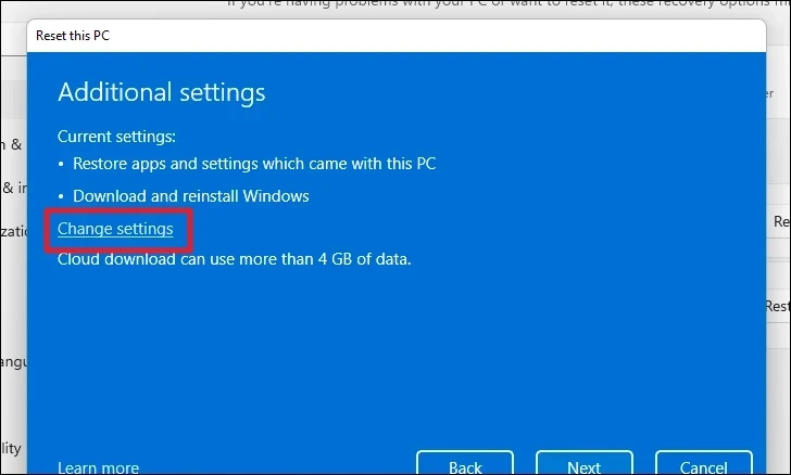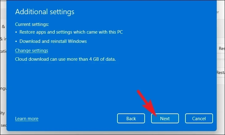 Step 6: Choose the reinstallation method. Selecting Cloud download will download a fresh copy of Windows from the internet (requires at least 4 GB of data). Alternatively, choose Local reinstall to use the existing Windows files on your PC.