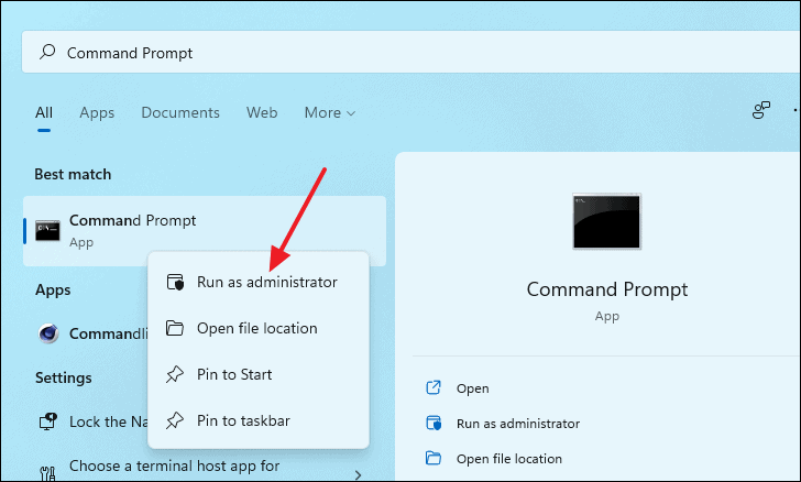 - Right-click on 'Command Prompt' and select 'Run as administrator'.