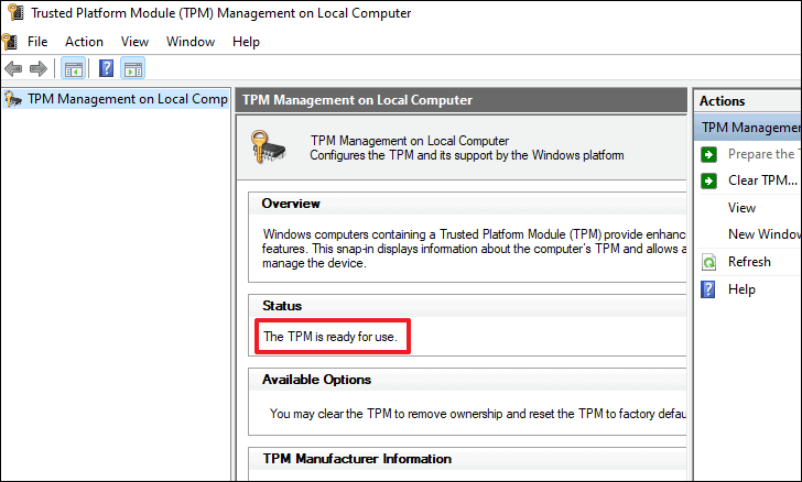 - Check the Status section. It should state 'The TPM is ready for use.'