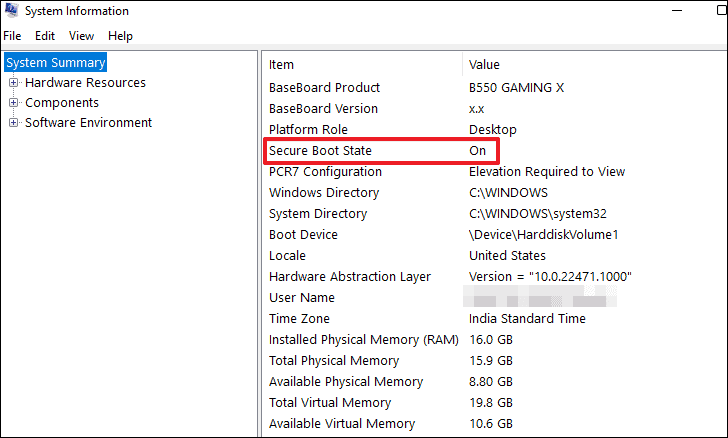 - In the System Summary, find 'Secure Boot State'. It should display 'On'.