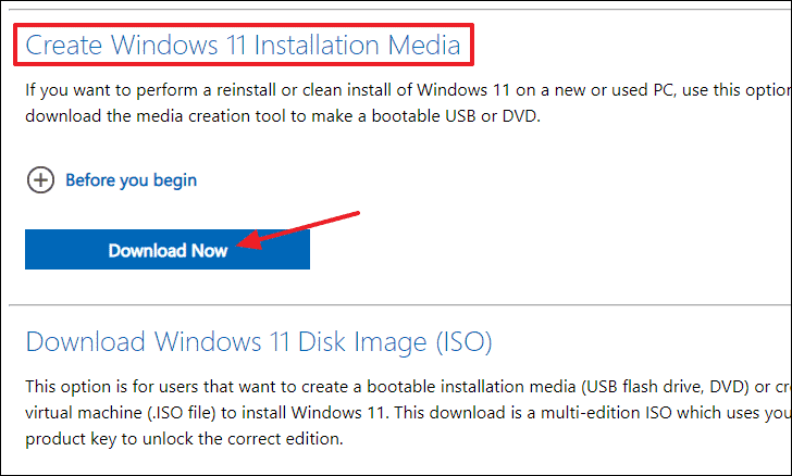 - Under 'Create Windows 11 Installation Media', click on 'Download Now'.