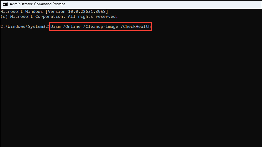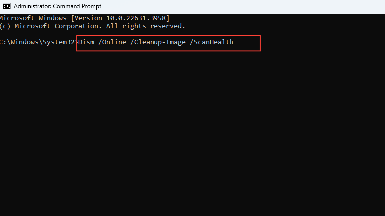 Dism /Online /Cleanup-Image /ScanHealthbefore pressing the Enter key.