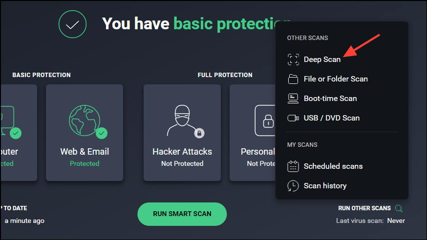 - When the antivirus program opens, look for an option like 'Complete scan' or 'Deep scan'. Click on it to start scanning your PC. Wait until the scan is complete and then perform the actions that your antivirus recommends.