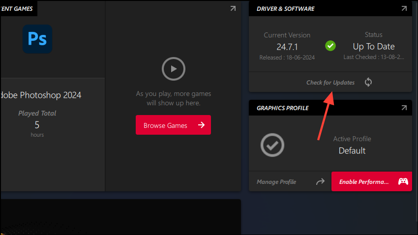 - Once the graphics driver software launches, look for an option like 'check for updates' or something similar. Click on it to check for the latest driver and software updates.